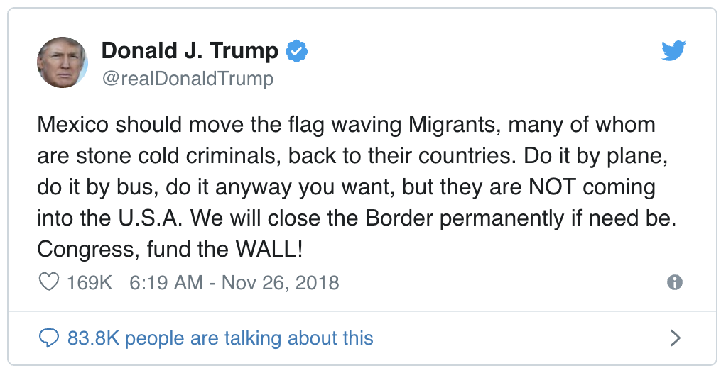 It looks so horrible on TV because Trump announced that asylum seekers will only be considered if they attempt to get into the U.S. through established points of entry. This is actually illegal, and his executive order to that effect has been struck down in the courts; but migrants, who heard Trump loud and clear, and know that the law is one thing, and what the folks in border enforcement actually do is another, are concentrating at a few points of entry instead of trickling in all along the border. Bottlenecks inevitably grow, and Trump has thrown gas on the fire with a policy to accept no more than a few hundred applicants each day, in a program dubbed “metering”, leaving the migrants stranded at the border for what could well be months at a time. Desperate, they try to storm their way in, and we get scenes like the one we saw a couple of days ago, with women and little kids being beat back with tear gas.