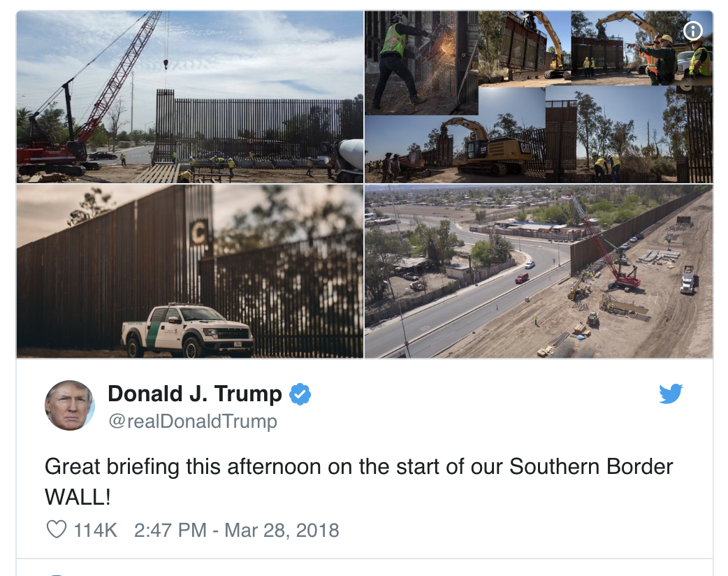 We’ve started the wall. Started up in San Diego and other places. It’s under construction with $1.6 billion dollars, but we’re going to ask for an increase in wall spending so we can finish it quicker.