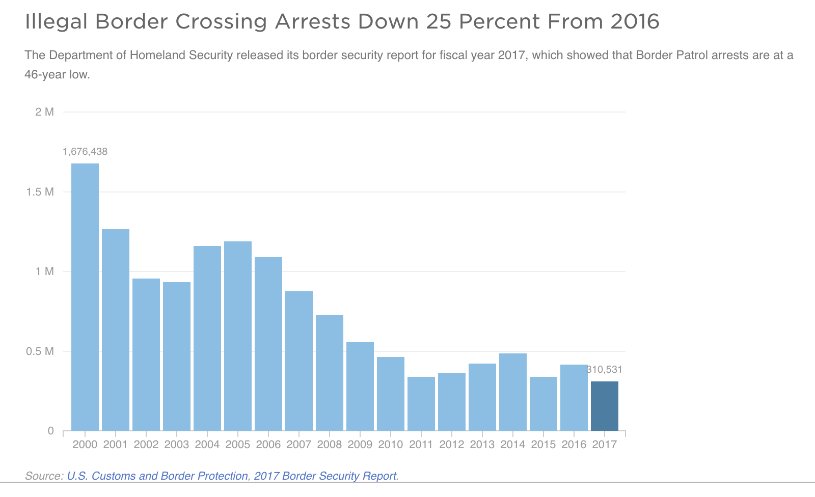 Yet, despite everything Trump does to make it look like one, there is no crisis. On the contrary, the Department of Homeland security reports that illegal border crossings are at a 46-year low, and the border is, in fact, under very tight control: