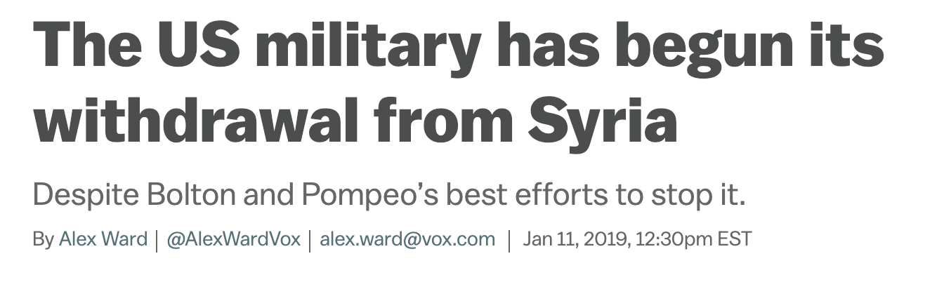 Sorry. Just because I’ve spent so much time on this story, I feel obliged to keep going with it. I posted twice before on Trump’s planned pullout from Syria, first when it was announced, and then when John Bolton seemed to modify the policy to the point of effectively reversing it:
