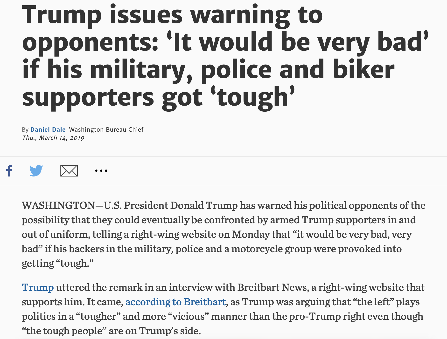 You want compelling evidence, Nancy? Well there it sits, posted for all to see on Breitbart Fucking News. I don’t even know how to put this. It seems silly and superfluous to lay out some sort of reasoned argument about the rule of law, the Constitutional role of Congressional oversight, the terrifying heresy of injecting threats of physical violence into the democratic political process etc. etc., yakkity yakkity yakkity. There’s neither need nor time for that any more. We’re no longer in debate mode. There’s no case left that needs making. This Mafioso wannabe pig of a man, this Trump, just said that if Congress doesn’t stop bugging him, if the left-libs don’t fuck off, he’s not vouching for anybody’s safety, OK? He’s got friends, right, and those friends have guns. Stuff happens. Things do break. People find themselves at the business end of assault rifles wielded by the loyal infantry, or maybe a certain cadre of bikers, OK? Just sayin’.
