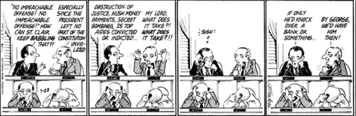 Yet nothing, so far, has done the trick. Will the report change any minds? Would anything? I’m reminded of the great Doonesbury strip from the Watergate era, with the Congressmen investigating Nixon howling with frustration at how nothing ever seems to be enough to show Tricky Dicky the door. “If only he’d knock over a bank or something” moans one.
