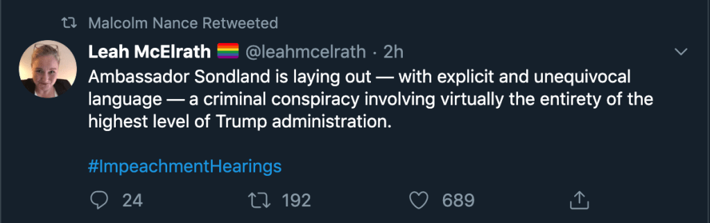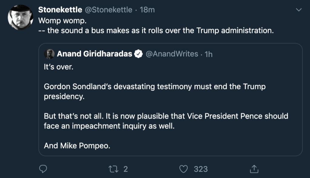 Reaction from the commentariat on Twitter has been almost delirious, as Sondland implicates not only Trump but virtually the entire executive branch, Pompeo, Pence, the lot. “Everyone was in the loop” he stated, under oath. “It was no secret”. Without any grant of immunity, and taking no shelter under his constitutional privilege against self-incrimination, Sondland is spewing it all out, every festering bit of it, including his own quite possibly criminal behaviour. The press and pundits can barely believe it.