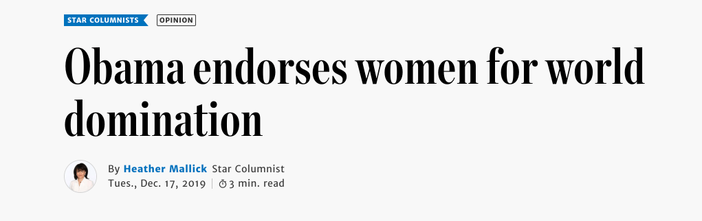 Former U.S. president Barack Obama just said this, out loud: “Now women, I just want you to know, you are not perfect, but what I can say pretty indisputably is that you’re better than us [men]. I’m absolutely confident that for two years, if every nation on Earth was run by women, you would see a significant improvement across the board on just about everything … living standards and outcomes.”