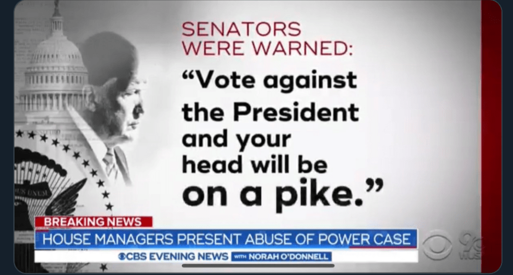 I’m certainly not the one to tell you that anything the Democrats say or do in this miserable process has a ghost of a chance of making a difference, and I’m well aware how futile Trump’s impeachment can seem, given who runs the Senate. Moreover the odds of a surprise outcome, vanishingly low in any case, were probably not improved by Trump engaging in what amounts to jury tampering and sending, according to the latest reports, this message to the quavering boot lickers in the erstwhile world’s greatest deliberative body: