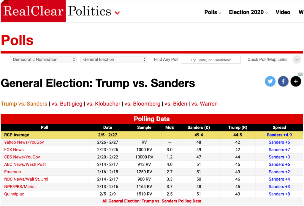 If Americans are really as brainwashed and closed-minded as the media make them out to be, how to explain such poll numbers? Yes, in a way, national polls are misleading almost to the point of being meaningless – what matters is not the national popular vote, but the vote broken down by state, which is how the Electoral College repeatedly installs popular vote losers in the White House, like it did with Trump, and Bush before him (a common misperception holds that the polls before 2016 were wrong; they weren’t. Hillary won the popular vote by almost the exact margin predicted. The problem is, the aggregate national popular vote isn’t the determinant. You can rack up a 25 million vote lead in California, and lose by 2 votes in Texas and four votes in Florida, and that gives your opponent 67 Electoral College votes to your 55). Still, people are desperate out there. They haven’t had a real pay raise in decades, union jobs are going the way of the dinosaurs, they can’t afford school, they can’t afford doctors, they see society crumbling around them while the upper crust makes out like bandits, and they long for solutions. Maybe Trump can sell them again that he’s the one who’s in it for the little guy, and anyway, brown people from Mexico are to blame and everything gets better when he builds that wall. Or maybe they decide that Donny let them down, as indeed he did – where are those coal and manufacturing jobs? – and give another firebrand with big talk and wild ideas a try.