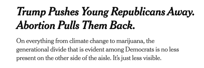 This political addiction to the anti-abortion effort has become so ingrained into the GOP rank and file that they’re practically born with it. It’s practically in their DNA. Just a couple of days ago, the New York Times published this piece, detailing how pro-life fervour is keeping the party faithful in Trump’s camp, even among the youngest members who could otherwise be relied upon to turn their backs on such a craven, self-serving carnival barker: