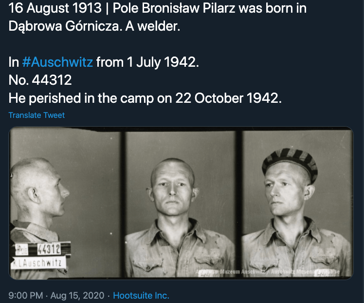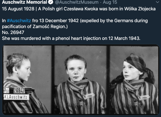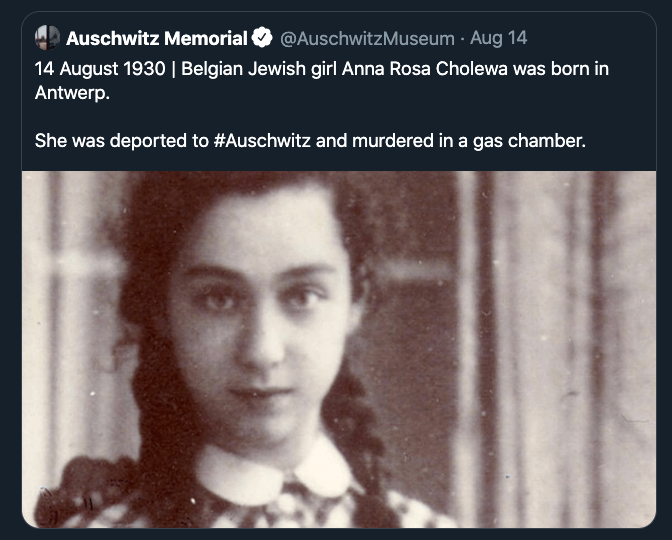 Then they started arriving in my timeline, day after day, often more than once in a day, every one of them filling me with sadness, dread, and heartache: pictures and brief bios of the slain. Some were family snapshots taken in happier times before anybody knew there was going to be a Final Solution cooked up by the monsters at Wannsee, and others were prisoner mugshots taken by the Nazis themselves, showing the doomed inmates of the concentration camps in their striped uniforms, some looking defiant, some resigned, many horribly, heart-rendingly afraid. Women, men, little children, old folks; doctors, lawyers, carpenters, plumbers and artists; Jewish people from all the lands Hitler conquered, one after another, paraded in front of my horrified eyes every time I logged in to see what the Lincoln Project was up to. Like these: