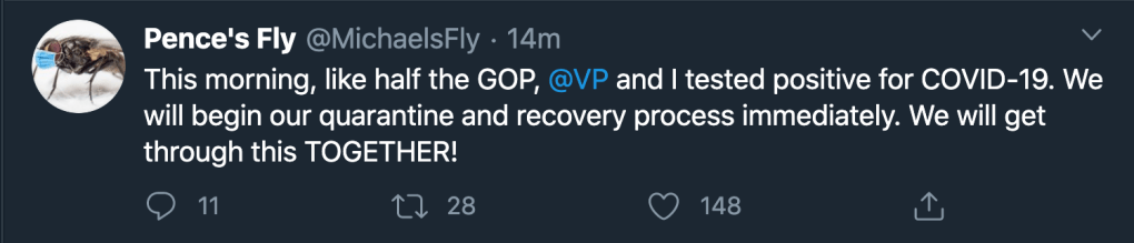 I don’t know if any of y’all had the stomach to watch all or any of last night’s supremely inconsequential Vice President’s debate, but I sure didn’t, tuning in as usual only for the pre and post-game festivities on MSNBC. There appear to have been two really significant takeaways from the 90 minutes of talking. First, and plainly most important, Mike Pence was oblivious to the presence of a fly perched on top of his blindingly white head of immovable hair for what seemed to be an awfully protracted couple of minutes. This was big. Social media lit up like 4th of July fireworks once the highly distracting bug had been sitting there for a while, and at least three quarters of all punditry in the aftermath of the broadcast was about The Fly. Within the hour, The Fly had his own Twitter feed, and was posting witty commentary.
