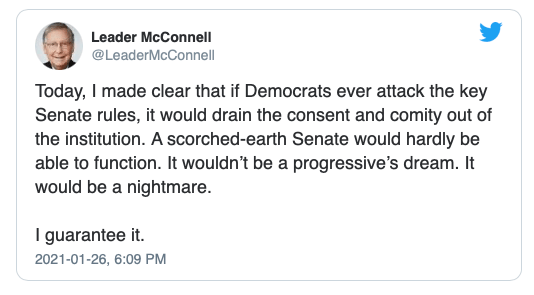 God grant me strength. Remember Biden talking about reaching across the aisle? Remember that fleeting sense, following the events if the sixth, that maybe some folks would be shocked back to to their senses? Well, post-insurrection it’s been the usual bullshit stunts and partisan hardball, as if nothing happened, and nothing is or indeed needs to be different. Keen as ever to leverage and abuse the arcane Senate rules of parliamentary procedure, Mitch began this latest session with a little of the old legerdemain, threatening to filibuster the routine organizational resolutions – which are required to establish, among other things, committee chairs and membership – unless the Dems pledged never to abolish the filibuster. Preserve my ability to gum up the works, or by God I’ll gum up the works. This prevented the Democrats from taking over as committee chairs, as is supposed to be their right now that they hold the majority, which it is, except no it isn’t, not on Mitch’s watch! The crafty old lizard eventually caved, sort of, but only when Manchin and Sinema, the cowardly and profoundly misguided Democratic duo of Senators, made noises that they would never allow their side to repeal the filibuster (perish the thought!); not as good for Mitch as a formal pledge, but good enough for now, and presto, precious days wasted as he runs out the two-year clock to the midterms. Meanwhile, he’ll extract ongoing compliance with his customary extortionate threats, see above. Just another day in the office.