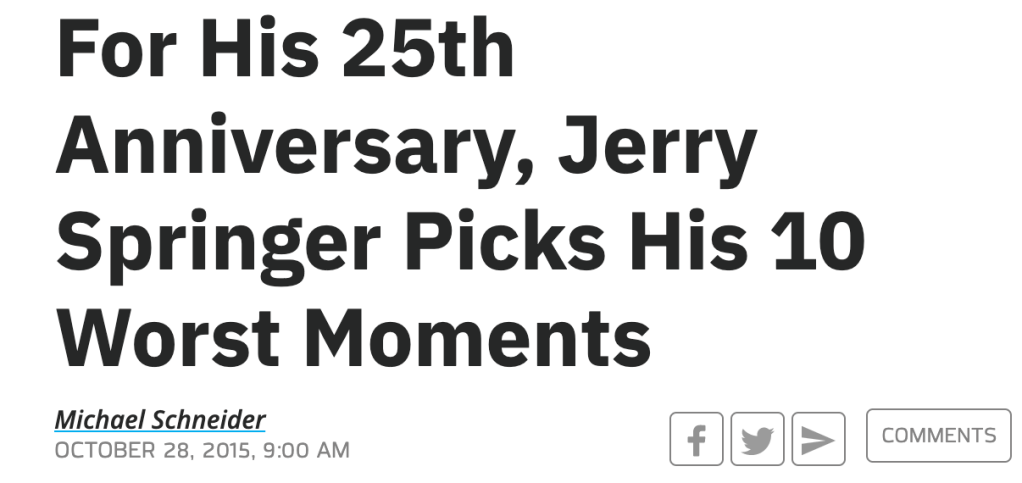It was twenty years ago, now, when I sat in my brother’s TV room with my sister-in-law Anne, while together we watched an hour of TV which, in retrospect, told us all we needed to know to predict the current condition of the American polity. It was an episode of the Jerry Springer Show. A guilty pleasure. We were watching it ironically, you understand. Back then, the shit Springer peddled was still shocking, still mind-bogglingly deviant, and you never knew what you were going to get, it could be a food fight, or a rather too literal animal lover who married a horse, or a guy who cut off his own dick with a pair of garden shears as a gesture of protest – all real shows, you can look it up – but that day, it was something even better. It was Three Pigs and a Trailer. By Jerry’s own reckoning, one of his Top 10/Bottom 10. Gotta tell ya, it was spellbinding.