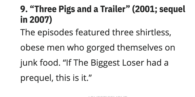 So here’s how it went, as best I can reconstruct it from memory (try as I might, I can’t seem to find any trace of the show on YouTube and the like): You’ve got these three worthless slobs. No, really: worthless. They’re all morbidly obese white guys, round and sort of squishy like medicine balls, hairy, filthy, disgusting, and they’re all shirtless in stretchy pants, that’s just how they roll. They’ve figured out some way to game the system, I forget how exactly, maybe they’re welfare frauds or something, but anyway, they don’t work, and they don’t do anything, really, except hang out together in a sort of Fat Piggy Club. For some reason – maybe their soon to be ex-wives objected – they don’t keep each other company at anybody’s home. Actually, they seem to have no homes. Instead, what they’ve done is commandeer an empty lot somewhere, like a parking lot, and they’ve assembled three big trailers, which I think were actually derelict mobile homes they found in a junkyard somewhere, into a big triangular formation, thus creating a de facto set of palisades and an inner courtyard. It’s rather like a castle. In the courtyard, they’ve placed three La-Z-Boy-type recliners, all ratty and torn, upon which they lounge all day in the sun eating hippo-sized servings of pork rinds, cheetos, and assorted other tasty junk food treats, while drinking gallons of beer. This is what they do. It’s all they do. That and pass gas.