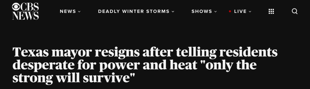 I mean c’mon, pull the other one! Sink or swim, it’s your choice! ? The City or County, along with power providers or any other service owes you NOTHING! ? Only the strong will survive and the weak will parish [sic]? Yeah right, like an elected official in a North American city is going to tell his citizens to go ahead and freeze then, if they don’t have the grit and the smarts to live free and proud, and by the way if what it takes to weed out the parasitic socialists is the near Biblical calamity of a days-long power outage in the middle of an historic cold snap, than hooray, we’ve got one of those rare events that pleases both Darwin and the God of the Evangelicals. The many typos and spelling errors were a nice touch, bolstering the authenticity, but honestly. An anti-social screed written by Ayn Rand at the end of a three day bender? LOL, and har-dee-har etc. But then this: