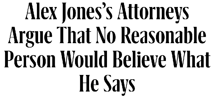 For Jones, the just-goofin-around gambit has uses beyond family law, since he’s being sued as well, by the parents of the slain children of Sandy Hook, who’re seeking some redress for the considerable grief, mental suffering, harassment, and death threats flowing from Jones’s strident, continually repeated claims that it was all a lie, a “false flag” operation in which the corpses were fake and the grieving parents were “crisis actors”. It’s not clear from the press reports whether this is an action for defamation, or intentional infliction of emotional distress, but the defence they’ve offered is the same: