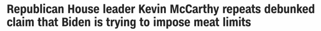 Wednesday night, Biden delivered a fine bit of oratory, proposing all sorts of humane and ambitious policies which would truly help ordinary people in myriad ways, and are widely popular. So what does Kevin McCarthy do? As soon as Biden stops talking, he runs out in front of the Fox News cameras, and hollers BIDEN PLANS TO CONTROL HOW MUCH MEAT YOU CAN EAT.