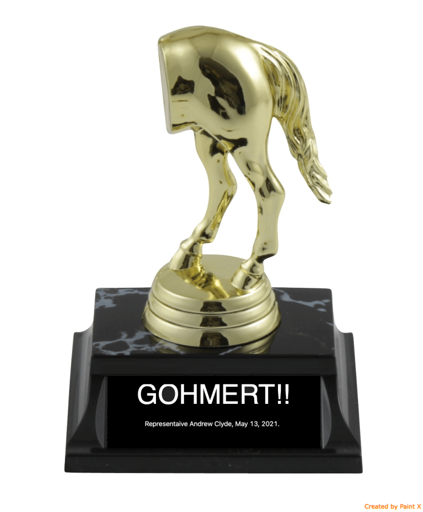 An avid promoter of conspiracy theories and (of course) gun rights, Clyde was last seen being fined US$15,000 for refusing to be screened through metal detectors before entering the House Chamber, presumably because he wanted to be packing heat for the next vote, just in case. He probably should have won a Gomey for that, but we can redress that injustice now by recognizing his strenuous exertions in the promotion of the latest GOP insanity, which might be referred to as the “It Never Happened” gambit.