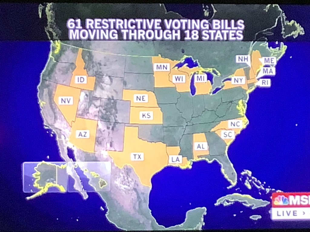 The voter suppression effort continues apace, with draconian laws already in place in Georgia, Florida, Arizona, Montana, Utah, Oklahoma, Kansas, and progressing at last count through the legislatures of eighteen others, with close to 400 bills introduced across the US, each overtly designed to thwart minorities and other Democratic demographics from voting. In Texas, a desperate procedural rearguard action by Democrats in the legislature has stopped the worst of them from becoming law, for now, but nothing can fend it off indefinitely. The most frightening aspect of these bills is not their many measures to curtail voting, but the power they grant to partisan operatives to overturn the results of elections if the Republicans don’t like the outcomes, thus skirting the obstacles presented in 2020 by honest civil servants and Secretaries of State. Had these laws been in place last time, Trump would probably be President today. Today’s map: