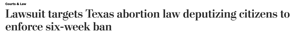 That Texas GOP is really pulling out all the stops! They’re empowering private citizens – unconcerned third parties, mind you, not necessarily anybody involved either directly or even indirectly in any woman’s choice to terminate a pregnancy – to enforce the abortion ban, by giving anybody who pleases a private cause of action against any clinics that break the law, or anybody who helps (like, say, somebody who gives a woman a ride to the clinic). They’re also throwing in $10,000.00 cash prizes to those who win their court cases! Eleven other states are following suit, with identical bills; see, GOP State Legislatures don’t write their own laws any more, they get drafted in right wing think tanks and then sent out across the country to be enacted, in a sort of franchise operation. That’s how they all manage to introduce the same sort of measures at the same time, whether it’s oppressing women, disenfranchising minorities, or banning First Amendment rights.
