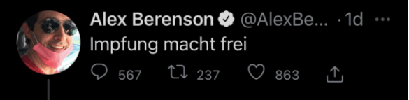 It gets even better. Like a lot of right-wingers, Berenson equates public health efforts to get shots into arms, and talk of things like “vaccine passports”, not just as attacks upon his Hard Earned and God-Given Murrican Freedom – USA!! USA!! – but tantamount, in fact, to sewing gold Stars of David on to the vests of all conscientiously objecting anti-vaxxers, and thus morally equivalent to the methodology of the Holocaust. In a truly horrendous Tweet last week, Berenson, doubtless having used Google Translate to look up the German word for “vaccination”, coined a snappy new catchphrase for his followers: