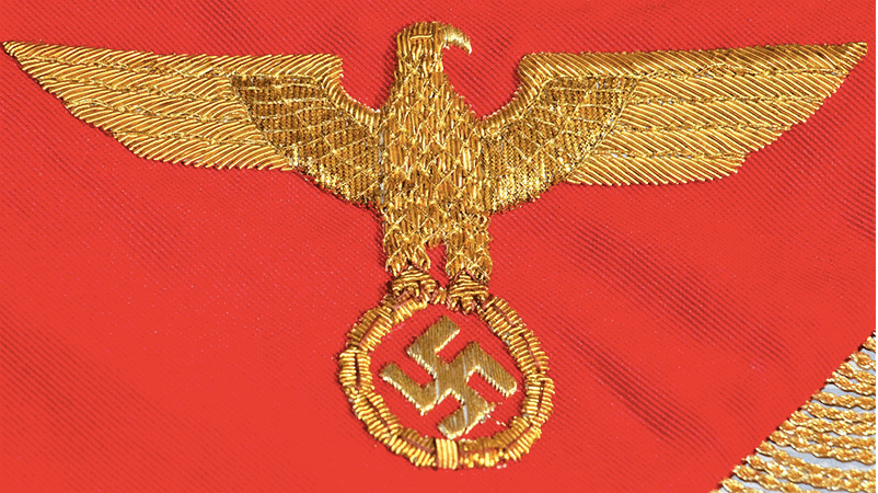 …but the one that got all the attention is the option pasted at top, owing to its rather startling similarity to Nazi iconography, as reproduced in the second image. I used to be a skeptic on MAGAWorld’s alleged adoption of Hitlerite symbols, like the apparent homage to a Waffen SS collar badge, known as the Odal Rune, that formed the stage layout for a recent CPAC conference (the same one that featured the Golden Tinkerbell Donald statue being rolled up and down the halls):