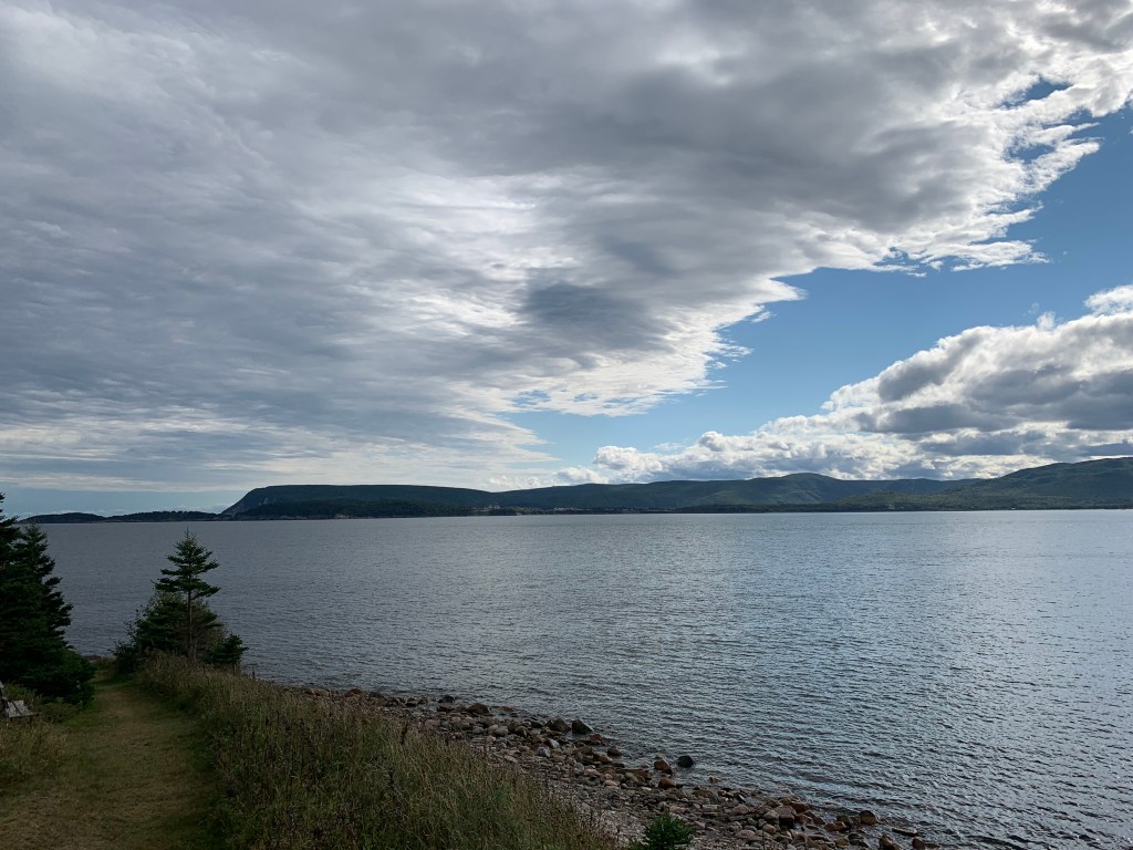 Then came last night. Kathy and I have been on a road trip to Cape Breton Island, and yesterday we stayed at a lovely little resort of seaside cottages in Ingonish, one of the stops along the celebrated Cabot Trail, on the fringes of vast Cape Breton Highlands National Park. Our cabin, which featured a hot tub (!), was right across from the long, narrow peninsula called Middle Head (on which is located the famous Keltic Lodge hotel), behind which loomed Cape Smokey, Cape Breton’s iconic landmark. This was our view as we sipped champagne and bobbed contentedly amid the water jets, watching the sun go down: