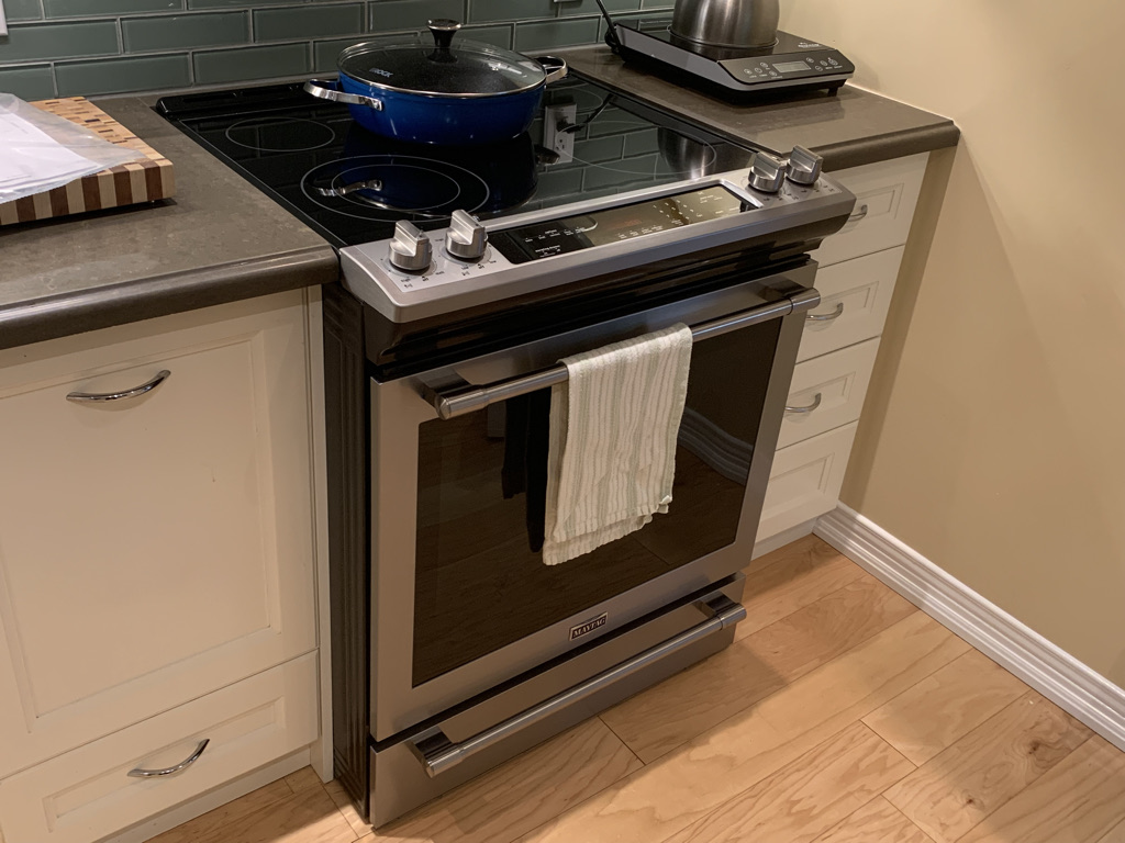 And there it now sits, as you can see in the attached photo. Ideally, we’d raise the feet a bit – these days, they deliver the appliance, but they don’t properly install it – but the hell with that, I’m not about to pull the bastard out again, with my luck it’d swell just a little from the ambient heat or some such shit, and refuse to go back. Unh-uh. Not falling for it. No sir. Not this guy.