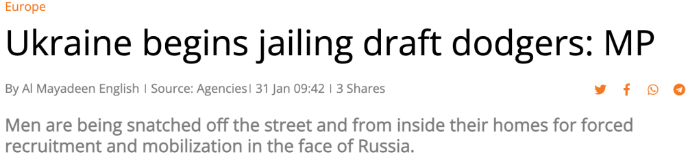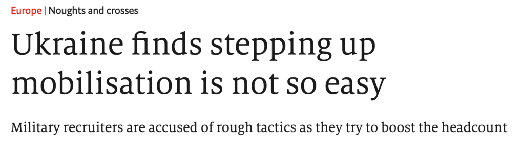 But the Ukrainians have been bloodied too. We think their losses may have risen to as much as half of the Russian total, terrible for a nation of their size, and I’m hearing reports that morale may be flagging and the effort to replenish the ranks, despite having instituted conscription, may be falling short. Given the circumstances, stories like this aren’t what we want to hear, and if true must be alarming to NATO policymakers: