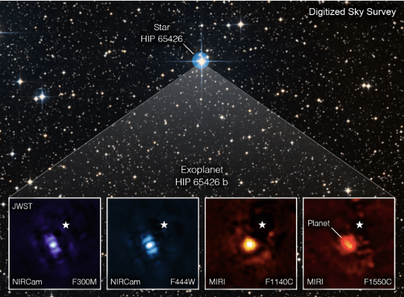 The Webb’s vision is so acute, it can even discern individual planets orbiting distant stars, and gather enough information about them to make spectrographic analyses of their atmospheres. This is object HIP 65426b, a young planet ten times the size of Jupiter orbiting a star that dwarfs our own Sun, roughly 400 light years distant: