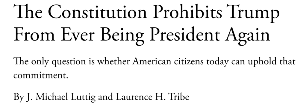 This was written in the wake of the Civil War, with the aim of preventing Confederate traitors from trying to assume responsible positions in government, and until Donald launched his coup attempt it seemed like a vestigial relic of an uglier time that no longer, thank the Good Lord, had any possible relevance. No such luck! Insurrection is back in style! Following the horror show on January 6, various scholars dusted off the old Amendment and recognized, perhaps with some surprise, the possibility, maybe even the necessity, of using it to run a pole through Donald. Most notable were Laurence Tribe and Michael Luttig, who wrote this article for The Atlantic :