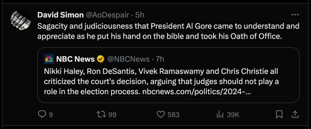 Then there’s the problem that six of the nine Supreme Court Justices are more or less complete and irredeemable dicks. Sigh. On second thought, maybe the odds aren’t anywhere near as good as 50-50. The talking heads on MSNBC sure didn’t think so tonight. The view that the Supremes would find some way to overturn the Colorado decision, even if it forces the conservative Justices to ignore their sacred doctrines of originalism, textualism, and State’s rights – hey, where there’s a will, there’s a way – was just about unanimous.