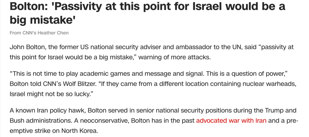 In fact, all things considered, I’d say the Iranian overture hands Israel a golden opportunity. But will Bibi take it? From his public statements to this point, it would seem not; he’s vowed a retaliatory response to any Iranian attack, and he may feel that he can’t back down now, and may even sense that the Israeli public would turn on him if he did. The power of emotional imperatives to drive policy at a moment like this shouldn’t be underestimated, and it isn’t like the Israeli P.M. is going to be hearing much in the way of advice to be cautious and temperate. He’s surrounded by hawks, hard men with utter confidence in certain fixed and unwavering ideas, guys who remind me a lot of one of America’s many like-minded policy-making disaster mavens, supreme asshole John Bolton, who tonight was, of course, urging Israel to now give it back to Iran with both barrels: