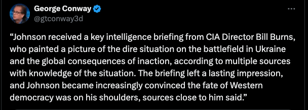 The story circulating among the pundits and national security types I follow on social media sounds like some sort of liberal fantasy written by Aaron Sorkin for season 2 of The West Wing: supposedly, Johnson received a personal briefing from CIA Director Bill Burns on the situation in Ukraine, and the grave geopolitical implications of a Russian victory, and saw the light. No, really, that’s the story: