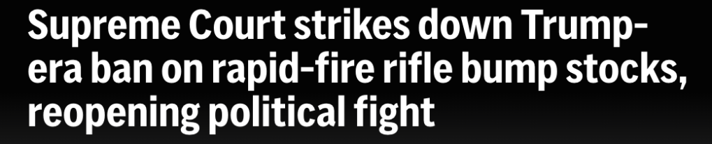 The ban on these diabolical things, now struck down by SCOTUS, was instituted in the aftermath of 2017’s horrendous mass killing in Las Vegas, when a 64-year-old Stephen Paddock, motive unknown, perched himself in a 32nd floor suite in the Mandalay Bay hotel, and used several weapons equipped with bump stocks to pour more than a thousand rounds into a dense crowd attending a music festival across the street. In a few brief minutes he killed 60, wounded another 400, and caused a mass panic in which about 400 more were injured. Everyone, even Republicans and their NRA backers, was horrified enough to allow the Trump administration, via ruling of the Bureau of Alcohol, Tobacco, and Firearms, to designate weapons equipped with bump stocks as “machineguns” as defined under the existing ban at 26 USC 5845(b), which reads: