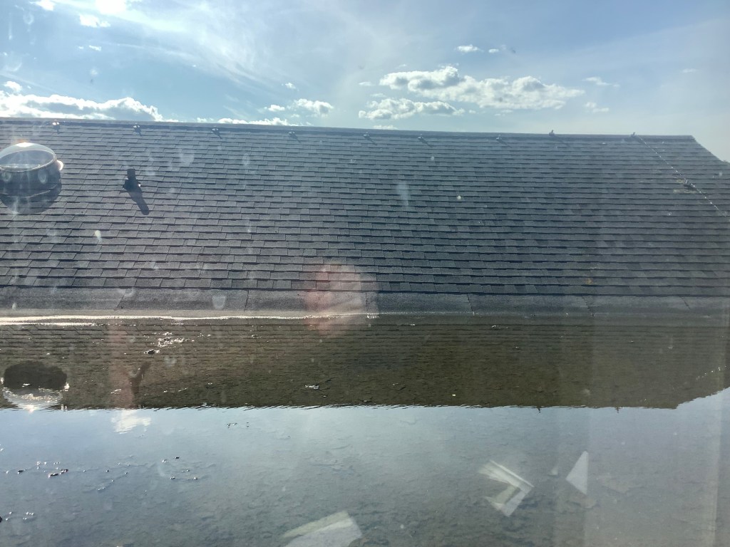 That’s our ludicrously flat roof, with its big pidgie pond at full capacity. On any given day in the Before Time there would have been between fifty and a hundred witless craphawks occupying that space, lounging contentedly all over the place, splishy-splashing in the water, making happy little cooing sounds. Now, not a one. For a few days now, not a single stinking bird. A couple have flown over the building, but kept going, veering away like the place was on fire or something.