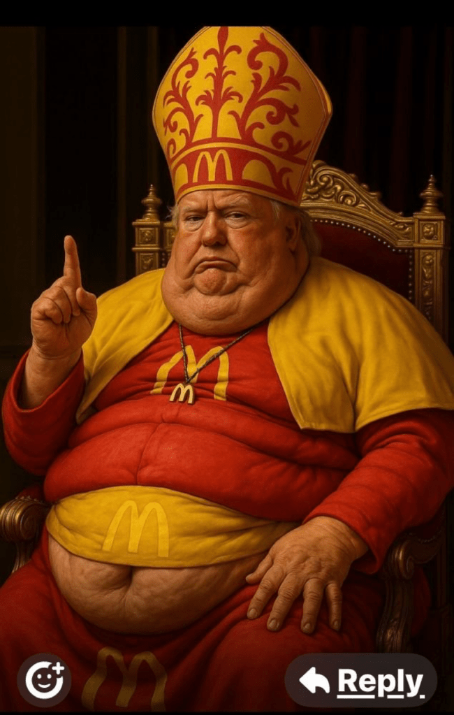 Where was I? Oh yeah, so fine, he’s a weapons-grade dumbass. So what else is new? Well, how about an astoundingly inappropriate display of narcissistic megalomania? O.K., he’s always been a self-aggrandizing, narcissistic megalomaniac, sure, but never as transparently as when he actually told reporters that he thinks he’d make a dandy Pontiff, now that Pope Francis has kicked the bucket and left an opening. “I’d like to be Pope”, he said on camera, unironically and apparently unabashed, “that would be my number one choice”. In case you think he was just goofin’ around, this AI-generated image was then circulated on the Donald’s own official Truth Social account: