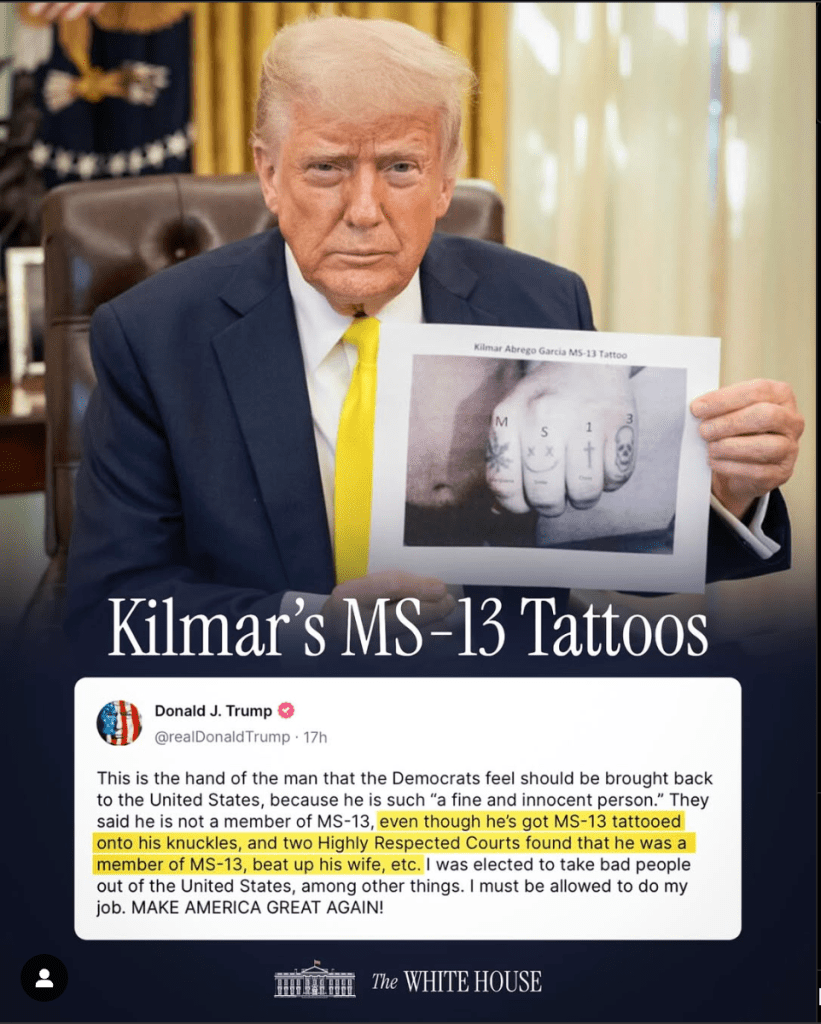 Which brings us to this delicious little bit of idiocy. It arose during one of his many disastrous interviews, this time with a fellow from ABC News, who had questions about the administration’s mistaken and unlawful deportation of Kilmar Abrego Garcia. Garcia, recall, is an immigrant with a job, wife, autistic kid, and no criminal record, who came to the U.S. to flee violent gangs in his home country of El Salvador, and was living under the protection of a court order expressly forbidding what Trump’s ICE hooligans went and did to him. As the reader will no doubt be aware, SCOTUS has ordered Donald to arrange for Garcia’s return from the Salvadoran gulag to which he, and doubtless many other innocents, have been exiled for life, and Donald, being Donald, has thus far refused to comply. As part of making the case that Garcia actually belongs in a Soviet-style prison camp despite being rounded up by mistake, as they’ve been happy to admit in court, Trump’s MAGA propagandists have been struggling to portray the poor guy as a member of the feared MS-13 criminal enterprise, to which end they’ve circulated doctored photos of his hand tattoos. They’re claiming, falsely (of course), that the marijuana plant, skull, etc. are known gang symbols that spell out “MS-13” in pictographic code, as indicated by the handy typewritten characters photo-shopped on to the original image. Here’s Donald in one of his pathetic on-line bleats asserting as much: