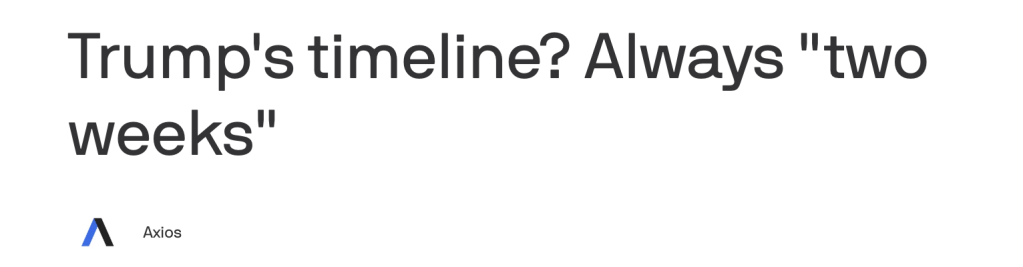 Look, we all know by this point that “I’ll tell you in two weeks” is Trumpspeak for I don’t have a clue, and I’m hoping you’ll forget the whole frickin’ thing while I manufacture a different shiny object for you to look at. Two weeks is the magic Trumpian temporal reset. With Donald, when he’s got nothing, can’t can’t come up with anything, and isn’t hearing anything from anybody else as he looks balefully around at the blank faces of the idiots in his Cabinet, the next move is as predictable as the tides: he tells you he’ll get back to you in two weeks. A new health care plan to replace Obamacare? He’ll tell you in a couple of weeks. A final decision on tariffs? Try back in 14 days. Infrastructure week? Won’t be this week, but he’ll have an announcement two weeks from now. It’s what he does. It’s as hackneyed a go-to move as his “sir” stories, and every bit as full of old rope. Even the useless corporate media have caught on to this, as can be seen in these headlines from Axios, the Times, and MSNBC.