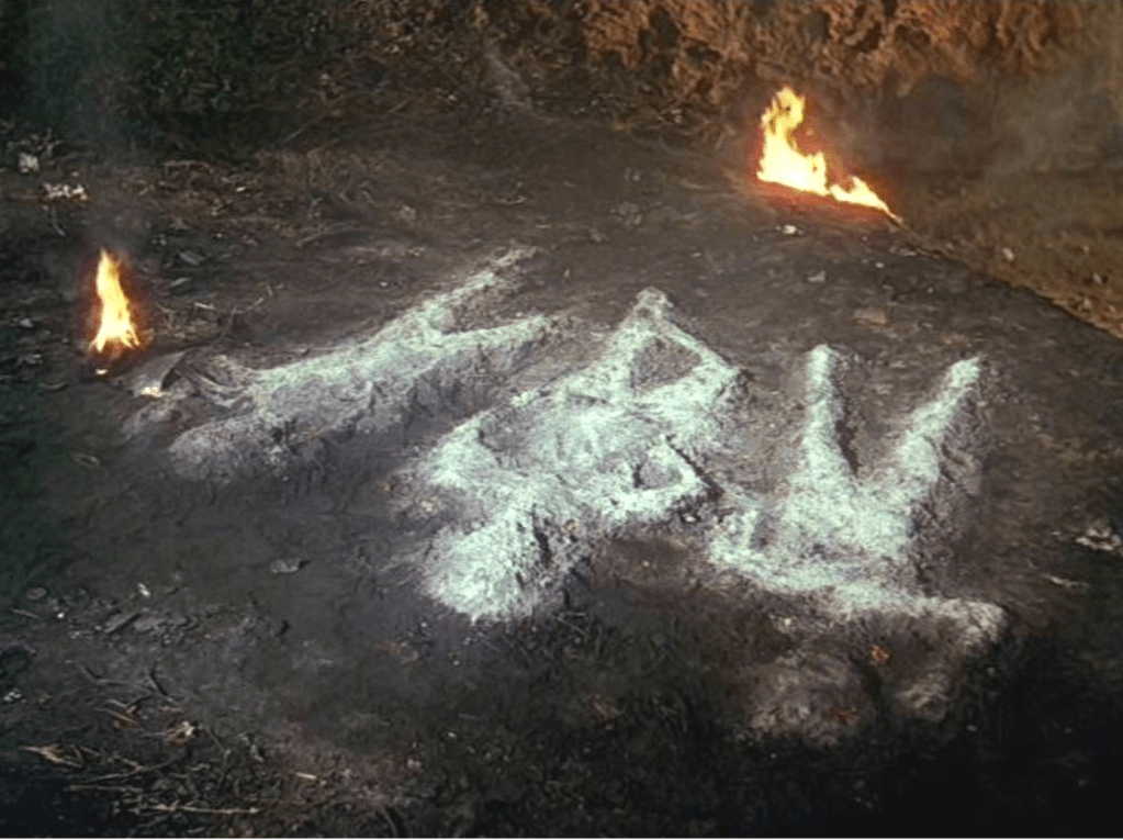 It was the first of the attached scenes that almost had me pissing my pyjama pants. Three locals have been left to keep an eye on what’s presumed to be a novel sort of meteorite. It’s still red-hot from its descent through the atmosphere, and our guys are watchmen, posted there to make sure it doesn’t start any fires as it cools down, when all of a sudden the damnedest thing starts to happen. A circular, threaded hatch on the object starts to unscrew. From the inside. Huh? Holy crap! Wait, what’s inside of there, waiting to exit out of that unscrewing hatch? Then, God help us, out pops the glowing sensor/weapons combo at the end of one of those long flexible periscopes, and no two ways about it, the frigging thing is looking around, emitting pulsed sounds reminiscent of sonar, taking the lay of the land and scanning for prey. Out here in the audience, we’re hollering Run!! Run for your lives ya frickin’ idiots!!, but no, two of the three sentries want to approach this frightening piece of unearthly technology and make friends – even though they’ve already figured out that they must be dealing with alien life forms – and they reckon they’ll be fine so long as they walk forward waving a white flag. Everybody knows what a white flag means, right? The little hispanic guy, God bless him, isn’t so sanguine, and offers some words to live by, which I’ve never forgotten: Don’t fool around with something when you don’t know what it is. Amen to that, brother! But they talk him out of his reluctance, approach the alien device bidding peaceful greetings, whereupon, naturally, the three of them end up as piles of disintegrated ash. That’s what the next people on scene discover in the beam of their flashlight: three pitiful human-shaped mounds of grey powder.