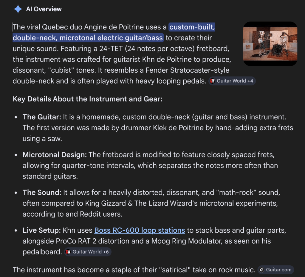 There’s a number of things that Angine to Poitrine – which is the French for the heart condition we refer to as angina, for some unfathomable reason – are doing differently. Much, much differently. To begin with, all of that sound is being made by just two people, both of whom come across, and not just to this untutored observer, as complete masters of their instruments. The big, multi-layered sound that eventually emerges is achieved through the use of some sort of computerized looping technology, not pre-recorded, but activated on stage. Watch: the guitar player lays down a line, then pushes a foot pedal, I’m guessing to start the loop playing, and then proceeds to layer another part on top, and then another, alternating as he goes between guitar and bass on his unique, home-made, double-necked instrument. In the creation of their unusual sound, it’s especially significant that this is no regular guitar (quite apart from being double-necked); it’s microtonal. This is from the Google search results: