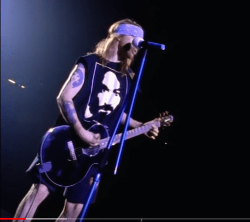 Here you go. A parting snapshot. Axl sings another assuredly great song, as these things are reckoned by the morons who govern pop culture, wearing a T-shirt that pays tribute to one of his musical heroes: