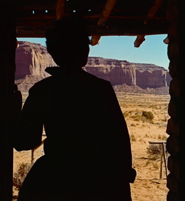 The Searchers is usually regarded as not just the greatest Western ever filmed, but one of the greatest movies of any genre, beloved by august organizations like the American Film Institute, respected critics like Roger Elbert, and legendary directors like Martin Scorsese. Part of that reputation is based simply upon the way it looks, especially on the big screen; its cinematography is exceptionally beautiful, with many scenes set against the spectacular backdrop of Ford’s beloved Monument Valley, the amazing geological wonderland on the Utah-Arizona border rendered iconic as the terrain for so many of his films. To this day, for those of us of a certain age, our conception of “the West” continues to be a landscape like this, just like the one where the Coyote chased after the Roadrunner: