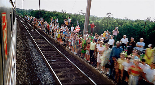 Bobby’s body was taken home from California, across the continent, by rail in June 1968. All along the tracks, whenever any sort of station was passed, people stood to watch the train go by and pay their respects. Mile after mile, station after station, there they were, some saluting, some standing at attention, some with signs, people of all ages, many of them children, as parents assembled their families to attend and bear witness. That day, no matter what your politics were, you stood in silence and paid your respects.